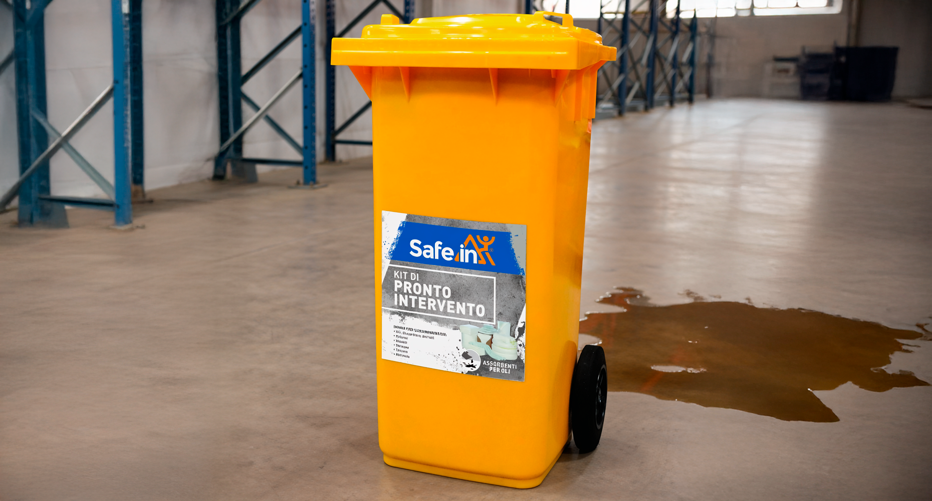 • Kit SafeIn® in bidone carrellato: la soluzione mobile e capiente per aree ad alto rischio.