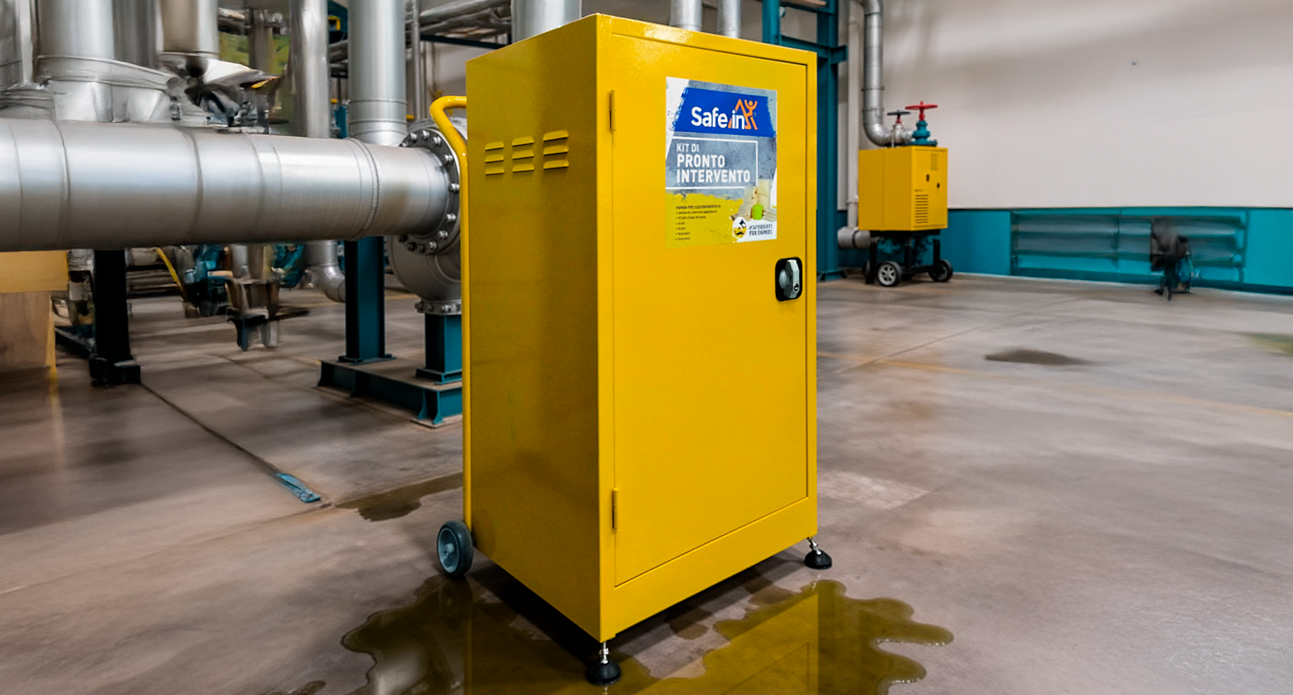 Il kit di assorbenti SafeIn® in armadio metallico carrellato rappresenta la soluzione ideale per raccogliere grandi quantità di liquidi. Armadio in lamiera d'acciaio verniciato RAL1021, con 2 ruote in gomma posteriori, ripiani regolabili in altezza, maniglia per facilitare lo spostamento e serratura con doppia chiave. L'assorbenza minima del contenuto dell'armadio è di 200 litri.