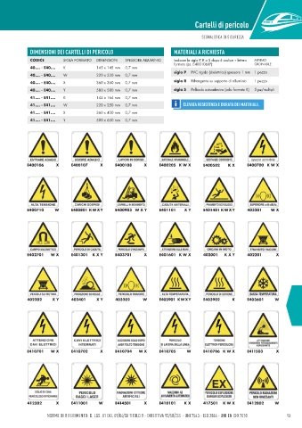 DIMENSIONI DEI CARTELLI DI PERICOLO MATERIALI A RICHIESTA