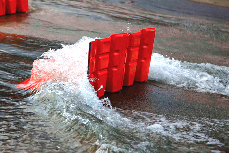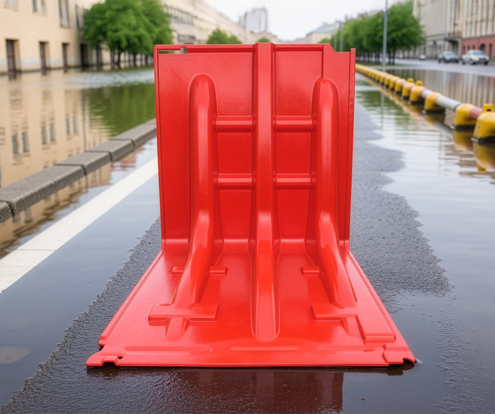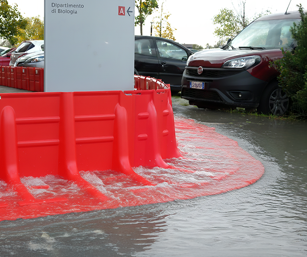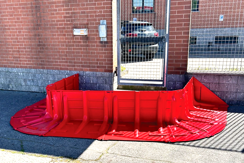 Barriera temporanea anti-inondazione autoportante in plastica ABS di alta qualità colore rosso. Progettata per una risposta rapida alle minacce di inondazioni, ideale per chiudere strade, strade, percorsi, parcheggi, fiumi, rive di canali, proprietà industriali e commerciali. Adatta per l'utilizzo su asfalto e cemento, può anche essere posizionata sull'erba. Dimensioni 980 x 680 x altezza 530 mm. Peso 6 kg.