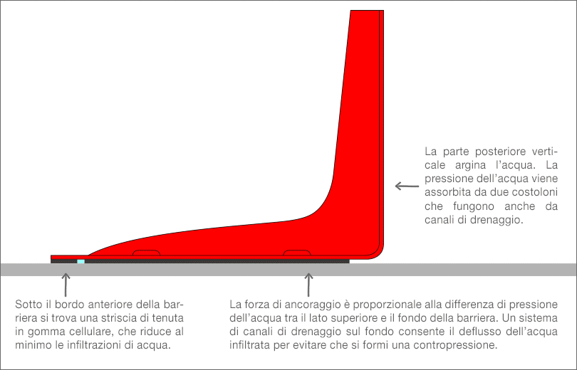 Non c’è rischio che la barriera scivoli via sotto la spinta della corrente: una striscia sigillante in gomma, posizionata sotto il bordo anteriore della barriera, riduce al minimo le infiltrazioni dal basso, bloccandola a terra fin dai primi centimetri d’acqua. Man mano che il livello sale, l’effetto “reggilibro” si intensifica, rendendo la barriera inamovibile anche se l’acqua dovesse raggiungere il bordo superiore e scavalcarlo.