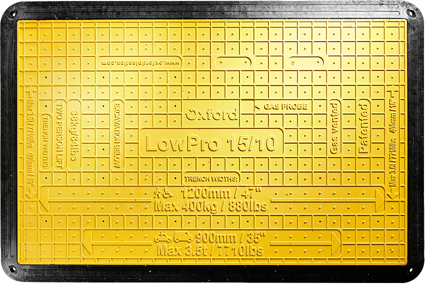 Pedana di copertura carrabile Low-Pro, antiscivolo, ideale per scavi e buche con larghezza massima di 900 mm per il passaggio di veicoli e 1200 mm per il passaggio di pedoni. Dimensioni 150 x 100 x altezza 3,7 mm. Peso 38 kg. Portata 3,5 tonnellate.